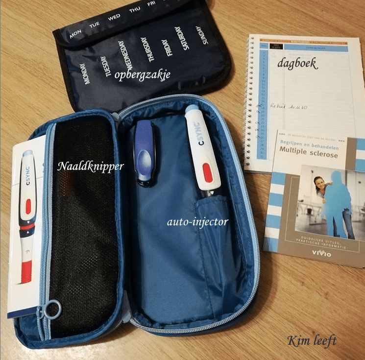 Ik kreeg ook nog een opbergzakje voor de auto-injector en de naaldknipper (de vervanger van die lelijke gele doos, maar wel compacter en handiger dus). Ook een warmte-koudecompres, een reistasje en een dagboek behoren nu tot mijn Copaxone-inboedel.