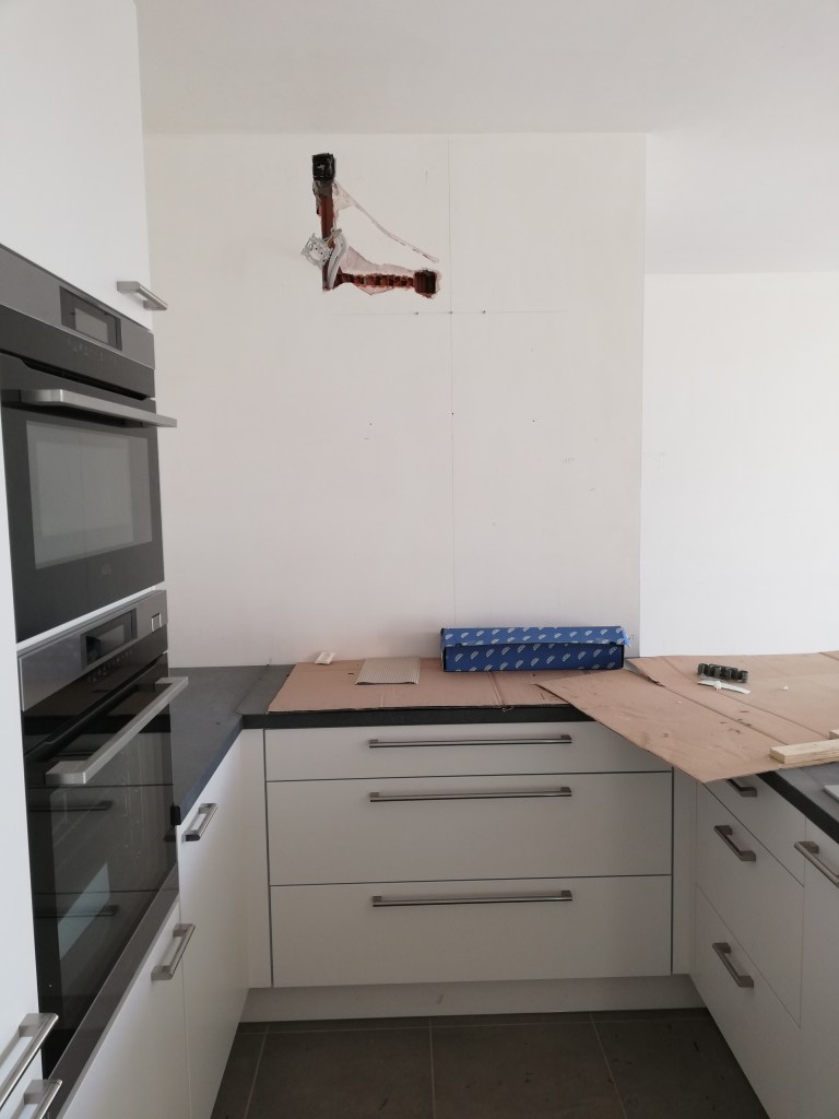 Januari 2020. De keuken is gezet, maar nog niet afgewerkt. Zo was het stopcontact voor de dampkap verkeerd geplaatst. Ook was de spoelbak door de keukenaannemer in de verkeerde kleur geplaatst (lichtgrijs i.p.v. zwart) en moest er nog wat afgewerkt worden (zoals siliconen, duw-springsysteem van de kastdeuren, spatwand waar een productiefout op zat, …).