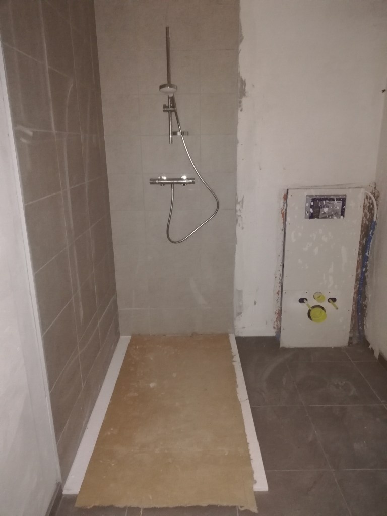 En om deze blog te eindigen: al een klein voorsmaakje. Het is nog niet afgewerkt. Zo ontbreken het tweede toilet en het douchescherm nog. Verder moeten er nog kleine afwerkingen gebeuren, maar er is in ieder geval al een beeld hoe het zal zijn. 😉