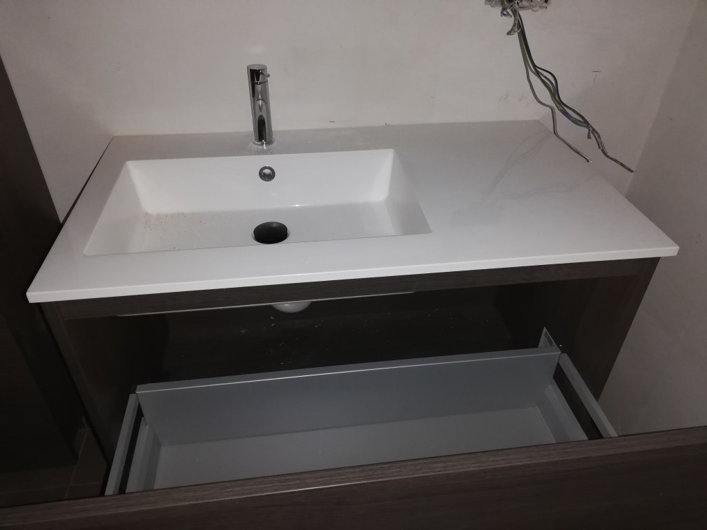 Dan het badkamermeubel. Het is een meubel geworden met een spiegelkast en een lade onder de wastafel. Daarnaast een grote kolomkast.