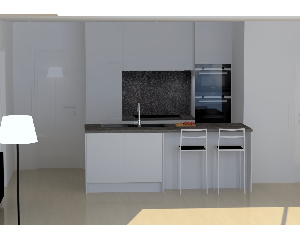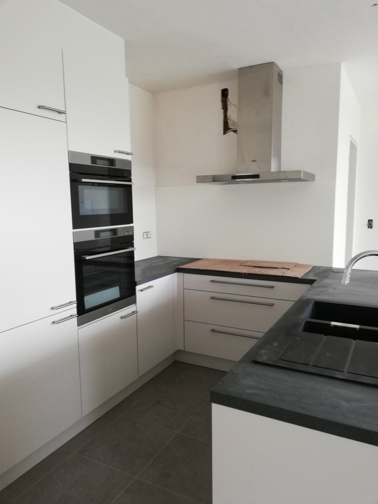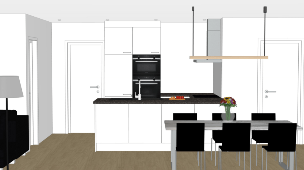 “Welke toestellen wil je?” – Ik wil een combi-oven, een microgolf/magnetron, een vaatwasser, een combi koelkast-diepvriezer (en geen diepvriesvak waar amper een pizza in kan). En dat allemaal in een relatief kleine keuken. Je moet tenslotte ook nog werkruimte/werkblad hebben.