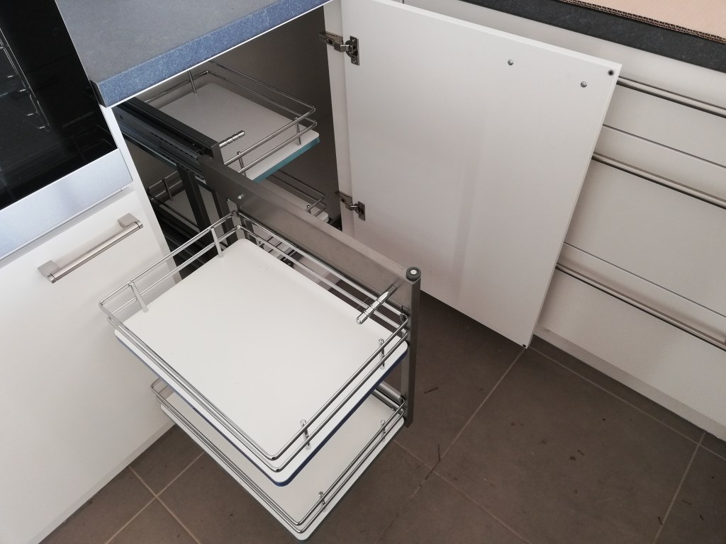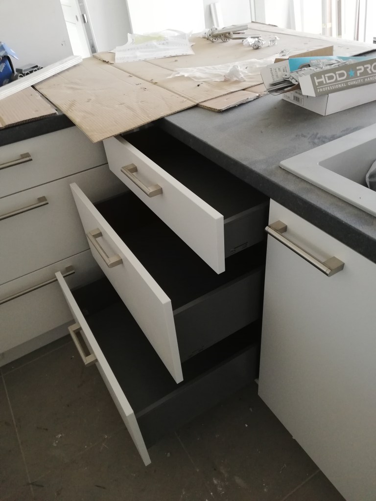 Ik wou ook zoveel mogelijk lades. In het ouderlijk huis hebben we, buiten de pottenlades, allemaal kasten. Ik haat het als ik iets moet hebben of wegzetten in een kast dat helemaal achteraan in die kast staat. Nee, daarom wil ik lades. Ik wou ook een apothekerskast, maar daar is geen plaats voor. En voor de rest wou ik zoveel mogelijk ruimte benutten.
