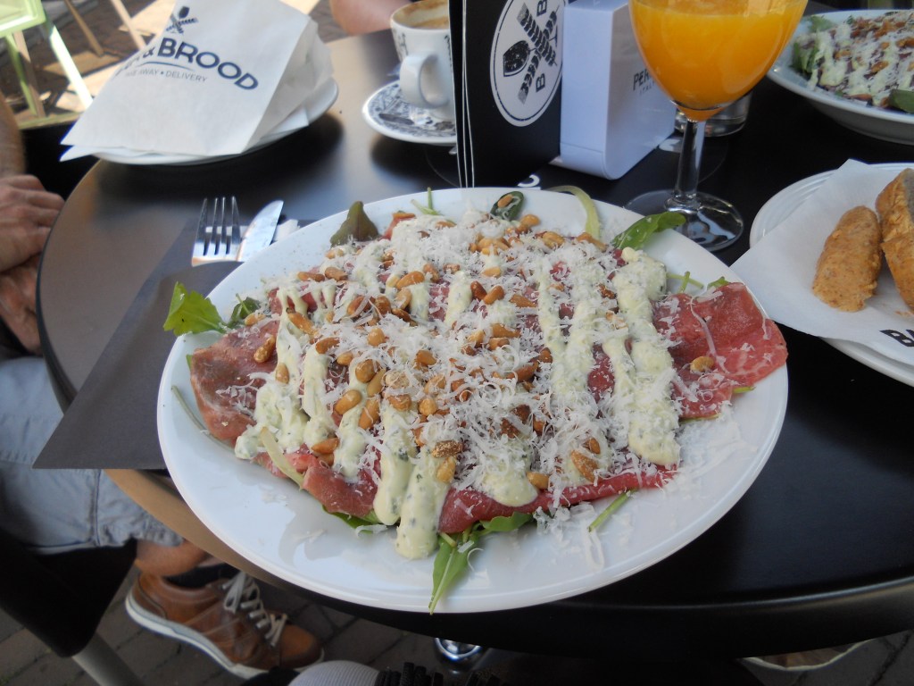 Ik heb de (voor sommigen onhebbelijke) gewoonte om altijd mijn eten te fotograferen. Tijdens de middag aten we op de Nieuwe Markt. Dit stond niet in mijn dagboek, maar ben ik even gaan opzoeken via Google Streetview. Lang leve mijn fotografisch én geografisch geheugen. Ik weet ongeveer waar ik moet zoeken op de kaart en voor de rest doet Google Streetview zijn werk. Enfin, ik at dus carpaccio en dronk vers geperst sinaasappelsap.