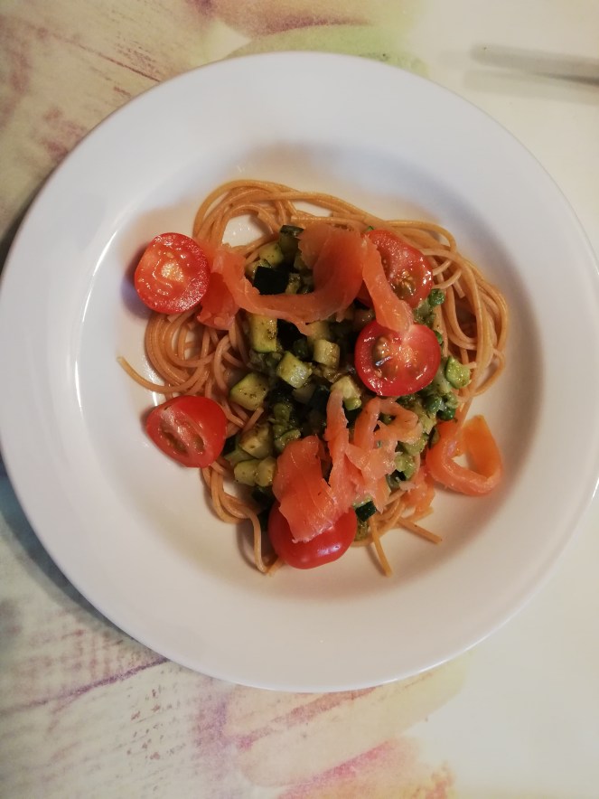 Dit recept probeerde ik een paar weken geleden uit en recent weer een keer. Het is gebaseerd op dit recept, maar ik heb het iets aangepast. Ik wil nog even vermelden dat de hoeveelheden kunnen aangepast worden naar smaak. Onderstaande hoeveelheden zijn zoals ik het ongeveer gedaan heb. Denk ik, want de hoeveelheid spaghetti, diepvrieserwten en snoeptomaatjes zijn op het zicht gedaan. 😉
