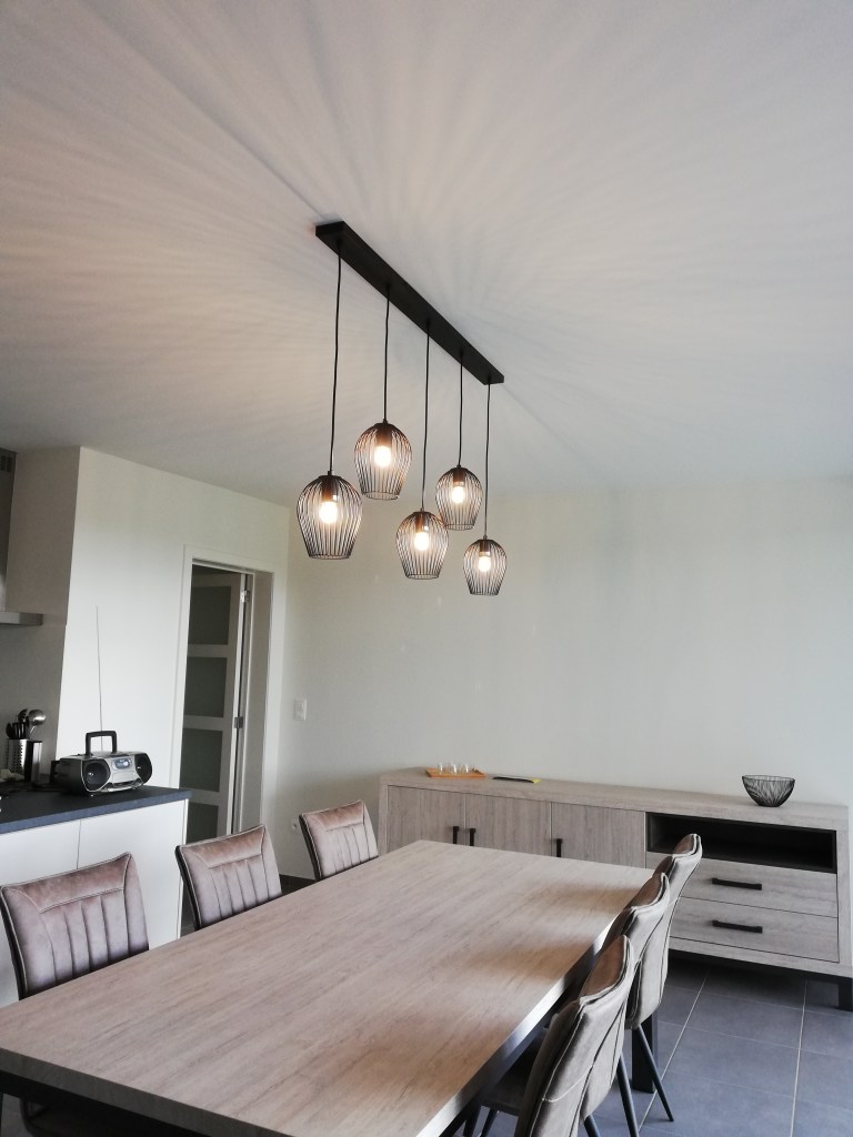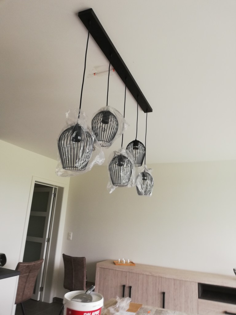 In de voormiddag hebben papa en ik de hanglamp boven de eettafel opgehangen. Papa heeft ook moeten kappen om de hanglamp mooi in het midden van de tafel te laten hangen. Als we de elektriciteitsdraad lieten hangen waar het hing, zou de tafel te dicht tegen het keukenaanrecht staan. Er kwamen mogelijkheden van een “gootje” of de lamp schuin te hangen, maar uiteindelijk zou de korte pijn het beste zijn: kappen in een pas geverfd plafond.