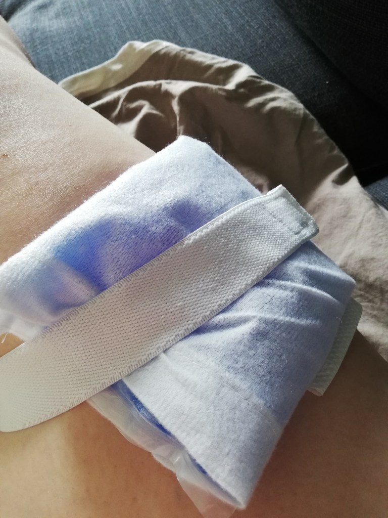 Uiteraard is het weer dinsdag Copaxonedag. Deze keer is het dijbeen aan de beurt. Zo’n omhulsel/overtrek voor het koudepack is dan echt wel handig. Moet ik het zelf niet meer vasthouden. 😉