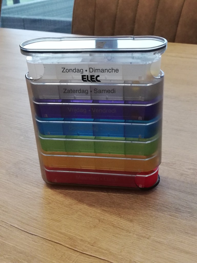 Ik kocht gisteren bij Aldi trouwens dit pillendoosje. Ik begon het een beetje beu te worden om telkens dat doosje open te doen, het pilletje uit de strip te nemen en het doosje terug dicht te doen. Nu staat het al netjes voor de rest van de week opgeborgen. Dit pillendoosje werkt trouwens zo: rood is maandag, je neemt dat er uit, je neemt de pilletjes en je duwt de “maandag” boven er terug in.