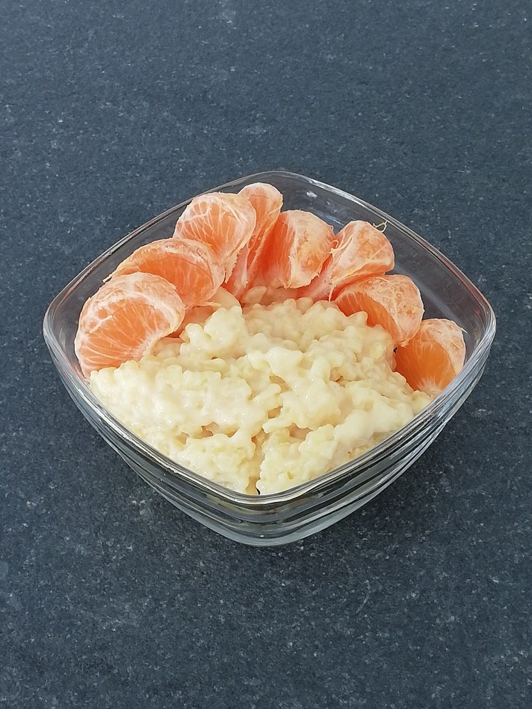 Vandaag heb ik geen snoep of iets dergelijks genomen. Wel rijstpap, máár dit is pure rijstpap zonder brol. Gewoon dessertrijst, halfvolle melk en saffraan. Geen toegevoegde suiker. En uiteraard met liefde gemaakt door papalief, die liefde proef je gewoon. 😉