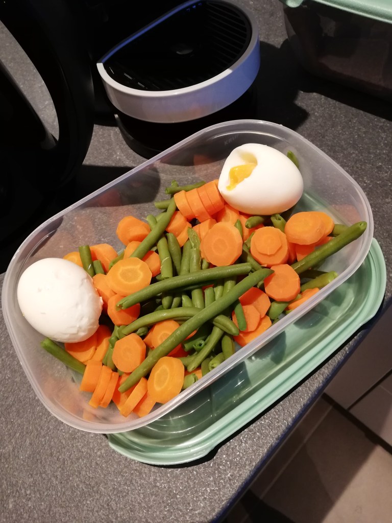 Na al het suikergeweld, probeer ik ook weer iets gezonds te eten. Ik maak mijn lunch klaar voor morgen. Ik kook boontjes en 3 wortels (in stukjes gesneden). Dat zal toch al zeker 250 gram groenten zijn? Ook nog twee hard gekookte eitjes erbij. Ziet er toch ook goed uit?