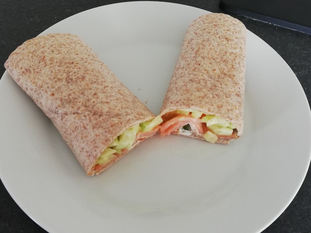 Af en toe flans ik iets ineen wat achteraf heel lekker bleek te zijn. Deze keer was het een volkoren wrap, besmeerd met roomkaas met kruiden en belegd met komkommer en gerookte zalm. Ik kende versie met (voorverpakte) sla, maar deze sla is niet lang houdbaar. En komkommer wel, dus weer een fijn receptje gevonden.