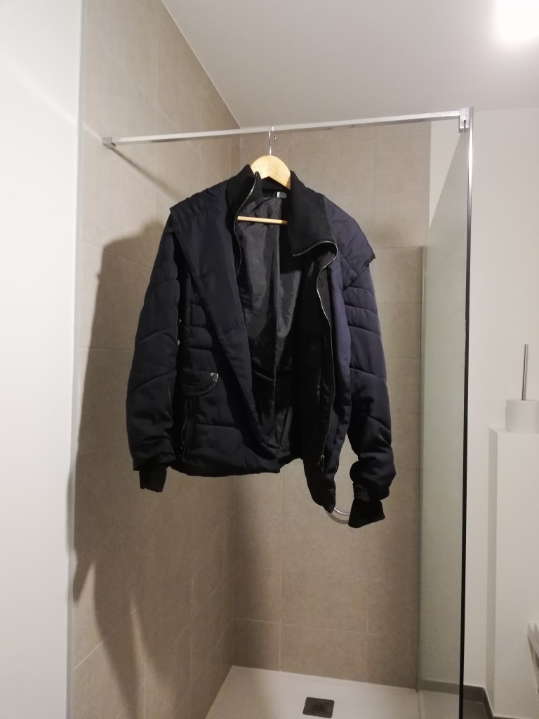 Ik heb mijn dikke winterjas nog eens bovengehaald. Het is ook nodig met die min-temperaturen. Maar aangezien het al een tijdje geleden is dat ik het nog gedragen had, was een wasbeurtje ook nodig. Deze jas mag volgens de wasvoorschriften niet in de droogkast. Mama hangt zo’n jas dan altijd aan de chauffage. Maar wat als je geen chauffage hebt? Dan is de douchestang een goed alternatief. 😉 De warmste kamer in mijn appartement en na enkele uurtjes was de jas droog.