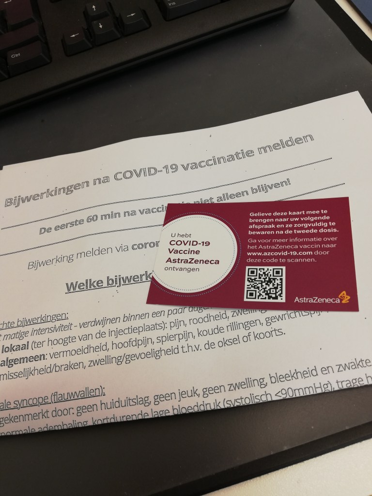 Het is gebeurd! Het vaccin is gezet. Het ging heel goed vooruit. Binnen en buiten, zoals ze ook wel zeggen. Ik kwam binnen, moest me aanmelden en dan even wachten totdat er een “hokje” vrij was. De verpleegkundige (of wie de spuit ook zet) was heel vriendelijk en vaccineerde heel traag. Nadien bleef ik nog een beetje nabloeden en toen vroeg ze of ik bloedverdunners pakte. Euhm, nee. Het is niet de eerste keer dat ik dat hoorde. Bij de MRI’s krijg ik dat ook telkens te horen nadat ze contrastvloeistof hebben ingespoten. Vroeger had ik dat totaal niet, dus ik weet echt niet waarvan dat dat komt.