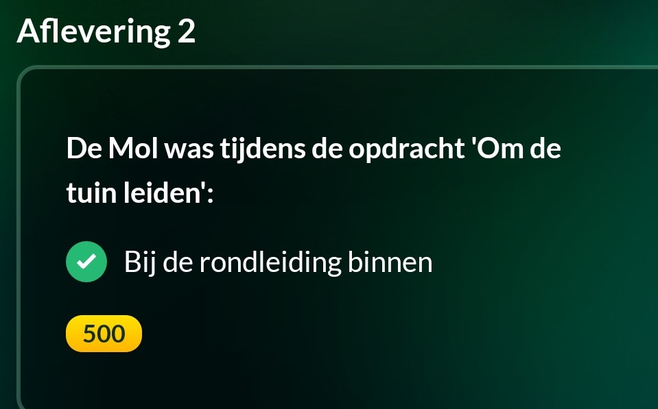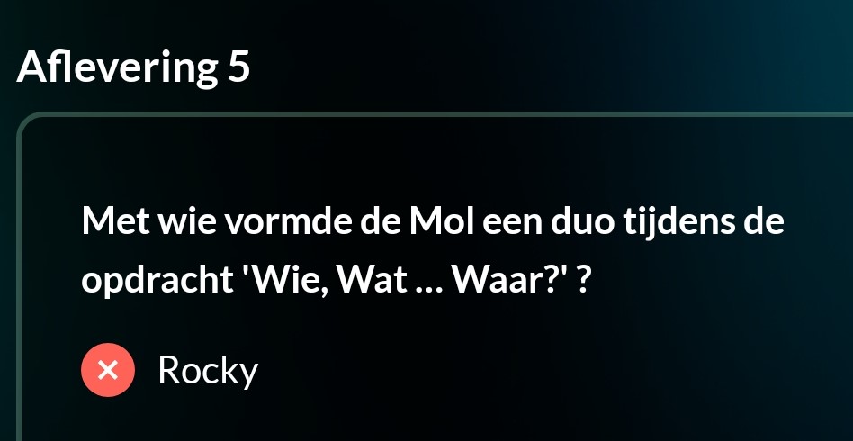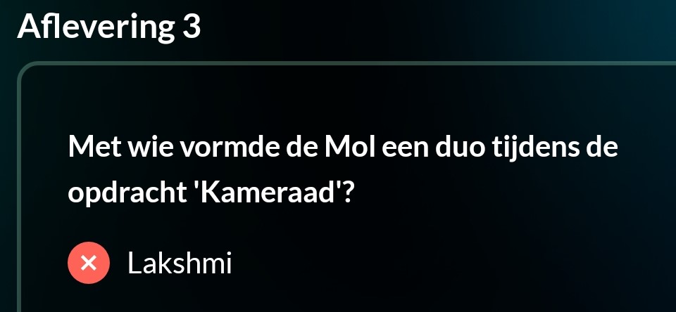 Hier heb ik de testvraag verkeerd ingevuld. Marije is nog steeds mijn mol, maar ik verwisselde even de opdracht “Kameraad” (waarin Marije met Joshua in de escaperoom zat) met de opdracht “Rode draad” (waar Marije en Lakshmi een duo vormden).