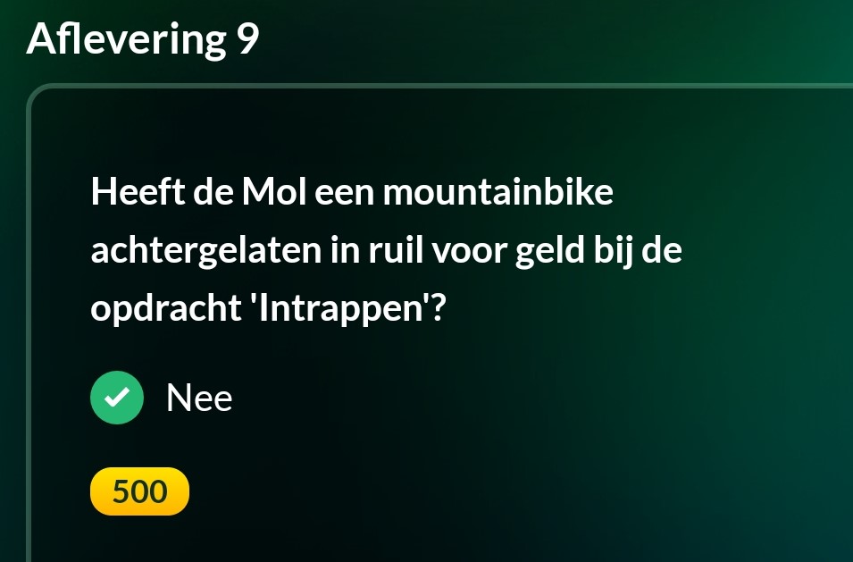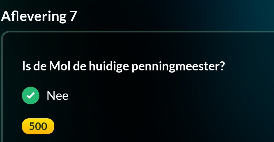 Op maandag komt er altijd een testvraag in de app. Een vraag die de kandidaten ook kregen in de aflevering. Bij deze testvraag zat ik nog op Lakshmi als mogelijke mol. Zij is ingegaan op het aanbod. Marije is één van de drie kandidaten die niet ingegaan is op het aanbod.