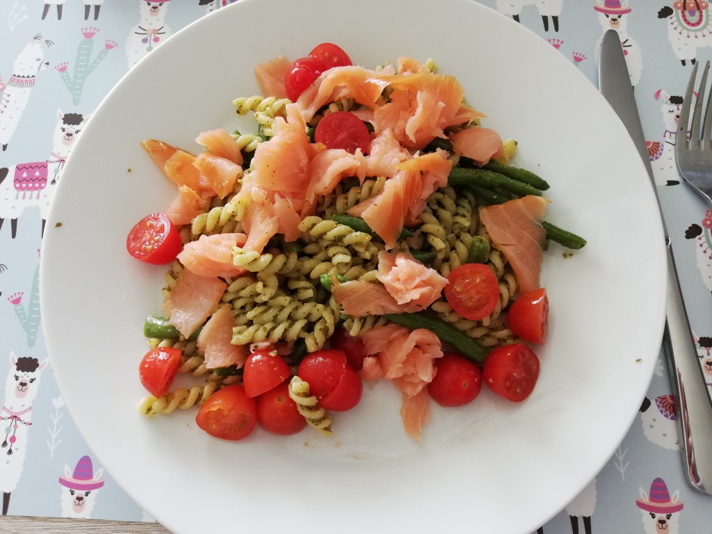 Ik heb als lunch de overschot van de “pasta pesto” opgegeten. Koud deze keer, en nog steeds megalekker. Een goed receptje dus. 🙂