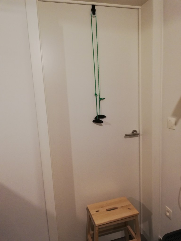 Naast weer een aflevering Nederland in beweging, deed ik ook oefeningen van de kinesist. Ze gaf deze katrol mee om oefeningen voor mijn schouder thuis te kunnen doen. Ik zit met rechte rug tegen de deur, neem in elke hand een handvat en beweeg mijn armen beurtelings naar boven/beneden. Mijn linkerarm geeft de meeste kracht door het linkerdeel naar beneden te trekken.