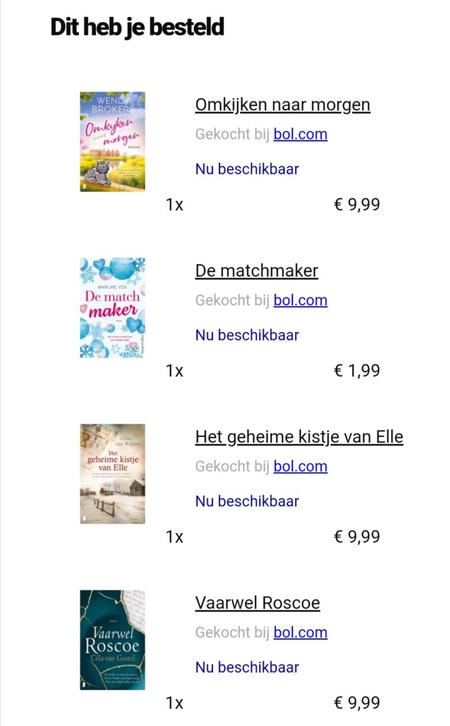 Wat ben ik ontzettend blij dat ik recent een e-reader heb aangeschaft. Een boek vasthouden is gewoonweg onmogelijk met de pijnlijke schouder. Gelukkig kan ik mijn e-reader gebruiken. Enkel is het boek (in papieren versie, bib-exemplaar) waarin ik bezig was niet als e-book uitleenbaar en staat het ook nog niet in Kobo Plus. Foert, denk ik dan. Ik koop het e-book gewoon en smijt nog drie extra e-books in het mandje. Zo steun ik die auteurs ook nog een beetje. 😉