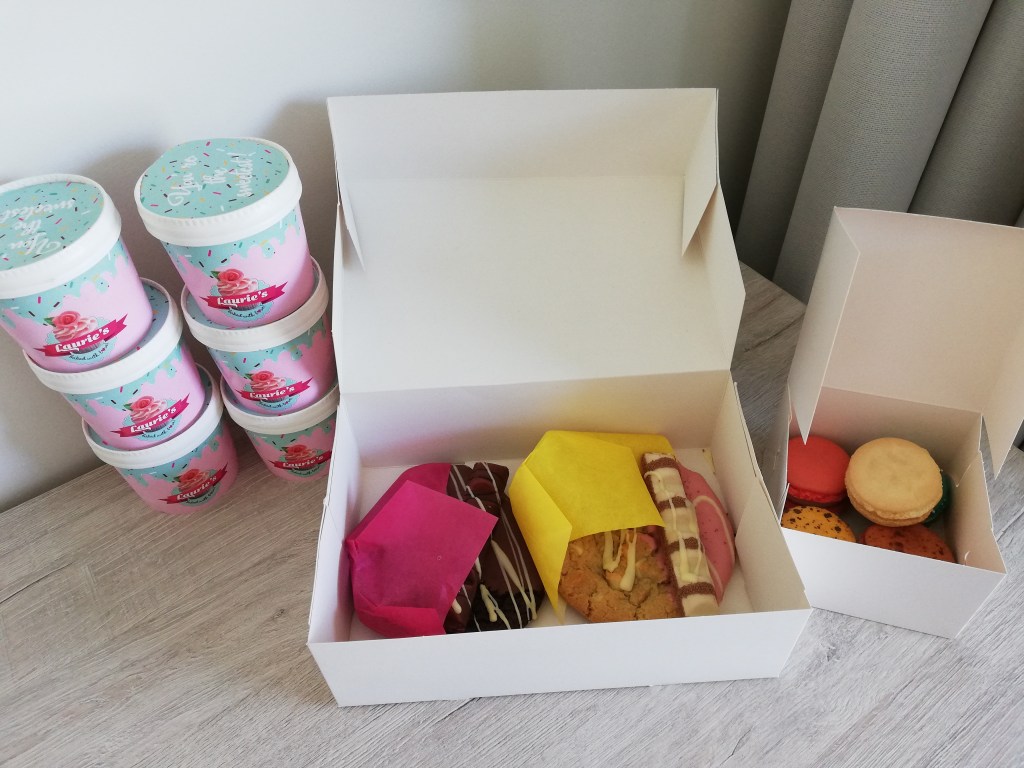 In het vorige dagboek vertelde ik al dat ik weer iets besteld had bij Laurie’s Bakery. Ik bestelde een klein doosje macarons, de cookies en en de ijsjes surprisebox. In deze box zitten de zes nieuwste smaken in. Ik heb er stiekem al wat van geproefd en ze zijn verrukkelijk. Op de onderkant van de ijsjes staat trouwens de afkorting. Zo kon ik aan de hand van die afkorting (en wat ik proefde) wel raden wat er in zat, alleen bij één ijsje niet. Ik herkende de smaak zo hard, maar ik kwam er niet op. Een berichtje naar Laura leverde niet veel op, want zij hield haar lippen nog steeds stijf op elkaar. 😉