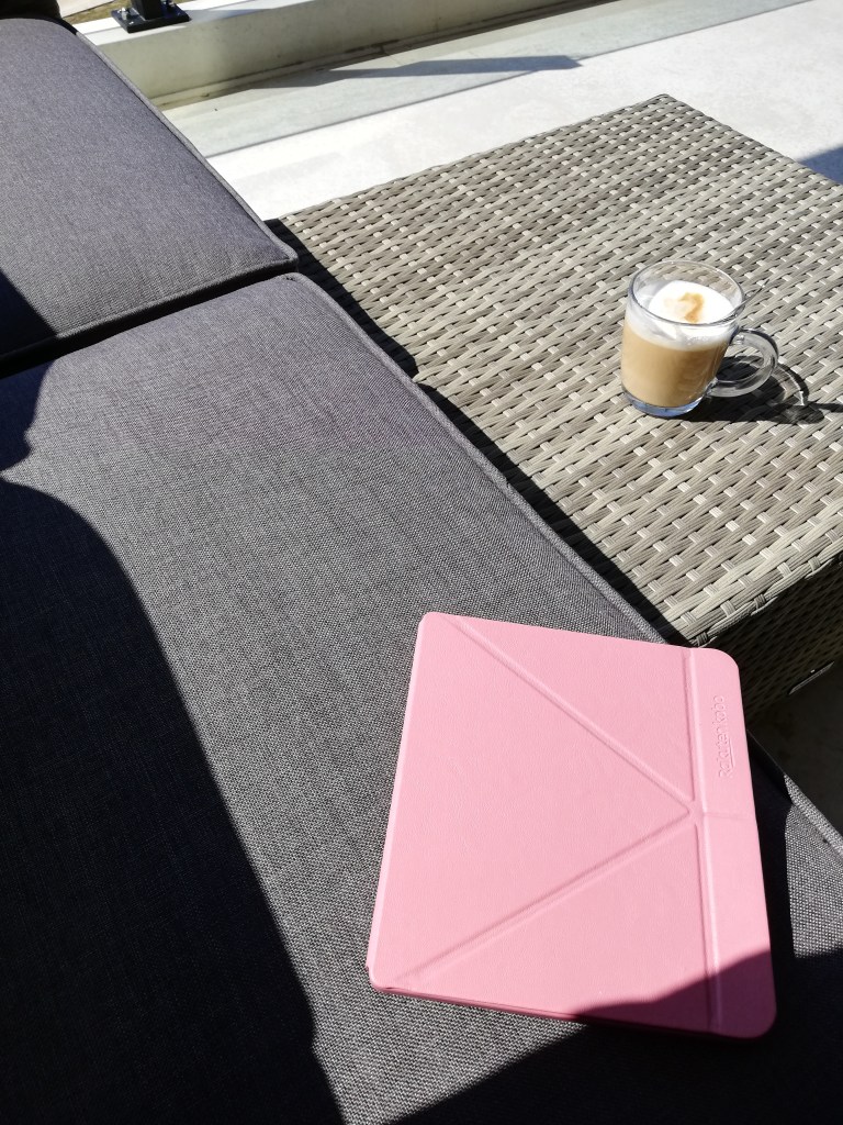 Het is prachtig weer, dus ik nestel mij neer in mijn loungeset met een koffie en een boek. Heerlijk! Die parasol gaat er heel snel komen, zodat ik veel langer buiten kan zitten, want nu vlucht ik vaak naar binnen als het te warm wordt in de zon.