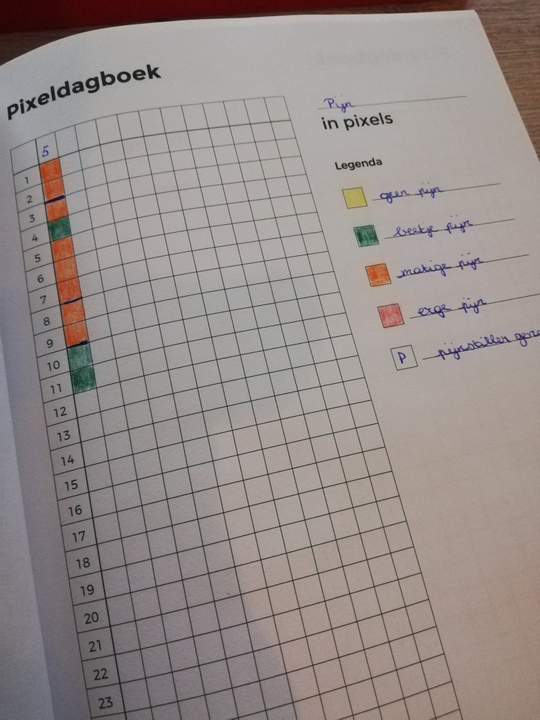 ’s Avonds vul ik het pixeldagboek in (uit het dagboek van Structuurjunkie). Ik merk op dat ik al twee dagen een groen vakje heb ingekleurd. Dit betekent “een beetje pijn”. Of zoals al die dokters met hun 0 – 10-gedoe-pijnscore: geef je pijn eens een cijfer. Jep, deze morgen weer van dat. Ik kan dat niet zeggen, dus ik flap er gewoon “5” uit. Ik ga daar eens een blog over schrijven, denk ik, want ik heb er mijn eigen gedachten over…