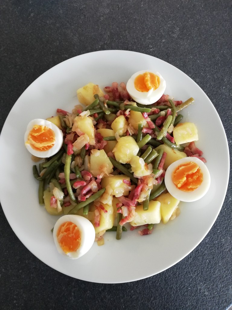 Ondanks de pijn is het me vandaag wel gelukt om te koken. Hiermee bedoel ik dus echt zelf aardappelen schillen, ui snijden, … en niet alles uit de diepvriezer. Ik maakte trouwens Luikse salade, naar het recept van Jeroen Meus.