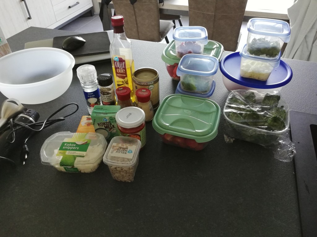 Zo stond alles al klaar en zat alles afgewogen en gesneden in plastic bakjes. Deze gingen na de foto wel terug de koelkast in, zodat het vers blijft.