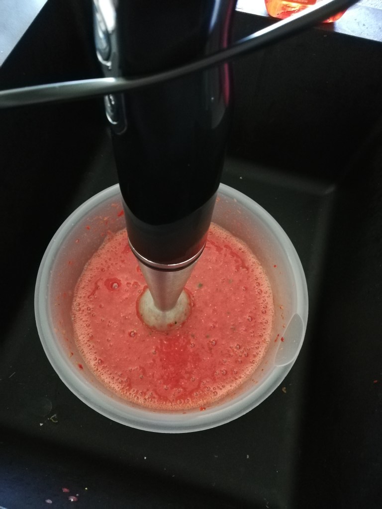 We begonnen met het nagerecht. 800 gram aardbeien mixen voor het aardbeiensoepje. Als ik iets mix, zet ik de pot meestal in de gootsteen tegen het spatten. Anders ligt heel mijn fornuis vol met spatten…