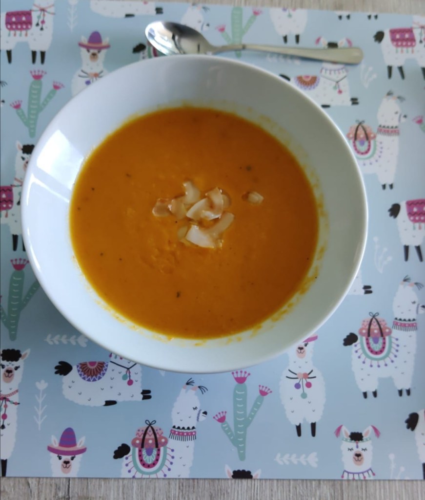 En zo zag het eruit na het mixen. Ik heb er wel wat meer water bij toegevoegd dan aangegeven, anders had ik bijna puree. Ik vind soep lekker als het niet te dik is, dus water en de overschot van de kokosmelk toevoegen.