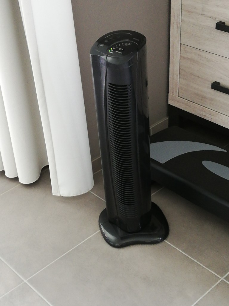 Ik kocht ook nog een kolomventilator. Ik ben vooral fier dat ik dat ding ALLEEN in elkaar gezet heb. Ik ben niet Handige Kim, maar dit lukte nog net. Het zweet stond wel op mijn voorhoofd, maar het staat en het werkt! 🙂