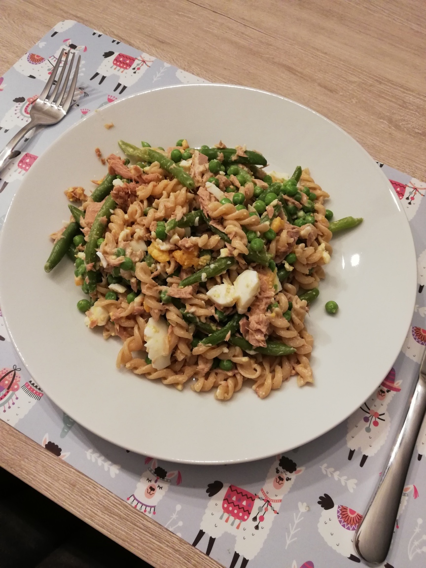 Mijn lunch bestaat uit de overschot van mijn avondeten de vorige dag. Hier werd duidelijk dat ik vaak vergeet foto’s te trekken. Deze foto is dus een foto van vrijdagavond. Het is trouwens pastasalade met erwtjes, boontjes en ei uit de Boost!-app. Ik voegde er enkel nog tonijn (op water, in blik) aan toe, gewoon omdat ik er zin in had.