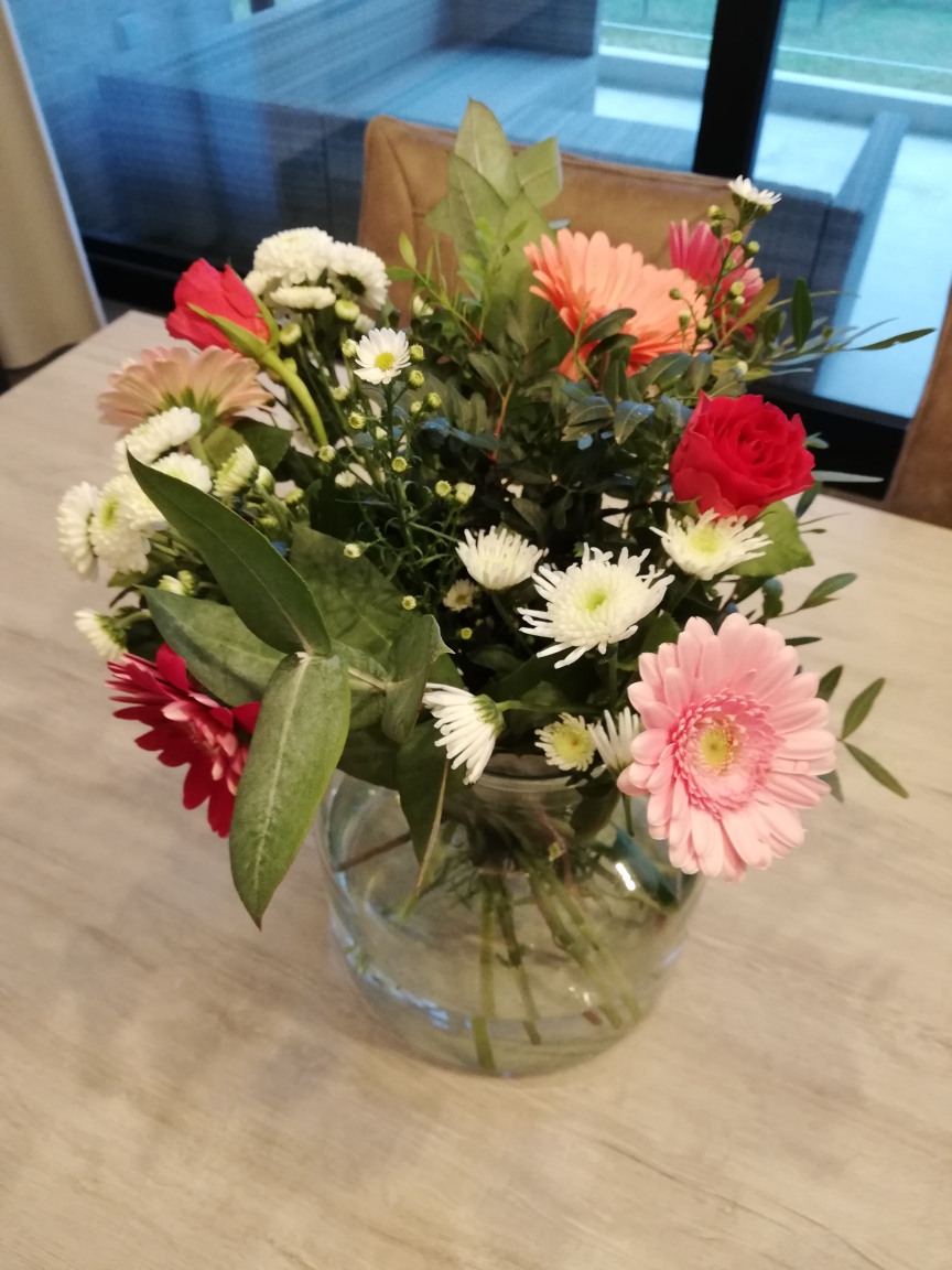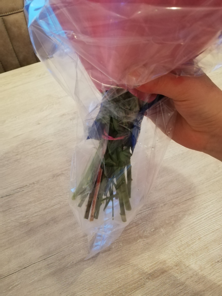 Ik koop ook een bos bloemen bij AH. Wat ik heel fijn vond, was het voorstel om een plastic zakje rond de stengels te doen, zodat het water niet blijft druppen. Er zitten ook twee voedingszakjes voor de bloemen bij het boeket. Eentje voor de eerste dag en eentje voor de vijfde dag. Ik heb me ook eens laten vertellen dat gewoon kristalsuiker dienst doet voor voeding van de bloemen.