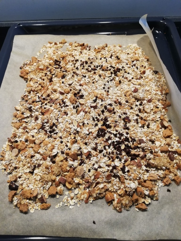 Ondertussen staat de granola in de oven. Wat havermout, gehakte noten, kokosschaafsel, volkoren koekje, zonnebloemolie en honingvervanger mixen, verspreiden over de bakplaat, 25 minuten op 165° in de oven en klaar is kees. Wanneer de granola aan het afkoelen is, voeg ik er nog chocoladenibs aan toe. Eens een chocoladeliefhebber, altijd een chocoladeliefhebber. 😉