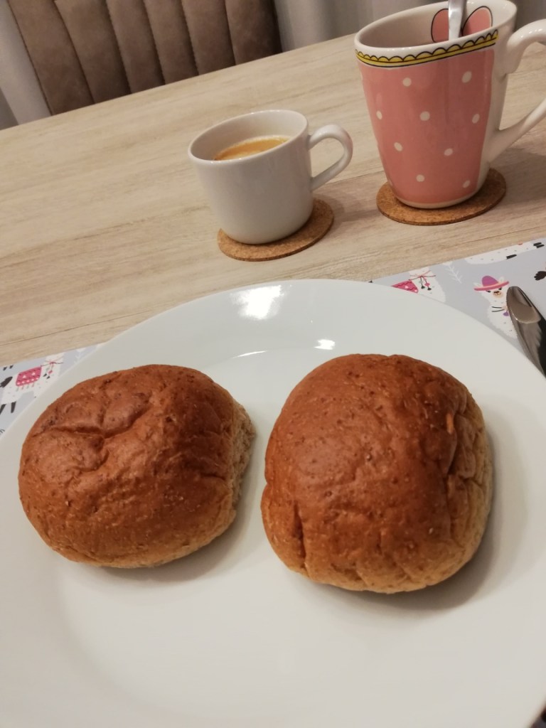 Goedemorgen! Rond ongeveer hetzelfde tijdstip als gisteren sta ik in de keuken. Ik eet twee volkoren bollen en drink een koffie en een grote mok thee.