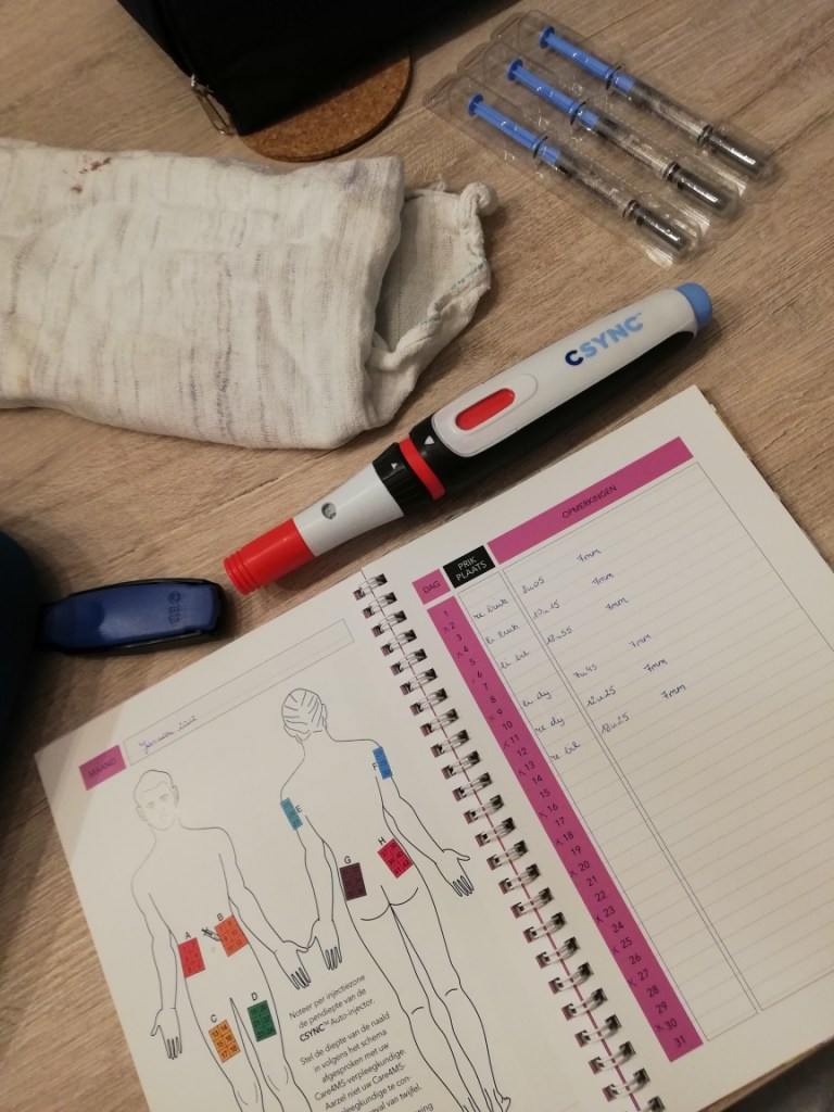 Het is zondag, dus Copaxone-dag. De prikplaats is deze keer mijn rechterbuik.