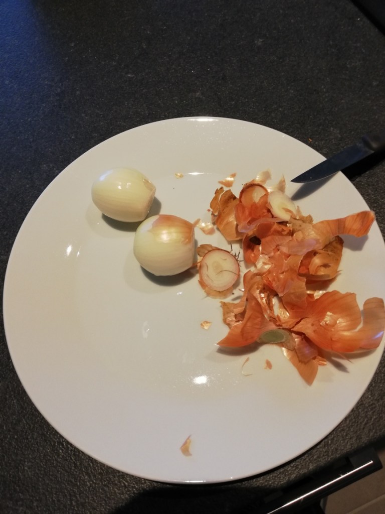 En ik maak het eten voor vanavond klaar. Mijn ouders en broer komen eten. Ik maak ratatouille met vegetarische balletjes en volkoren penne, weer geïnspireerd op de Boost!-app! Alleen, … uien pellen… ben ik echt de enigste die daar zo mee zit te sukkelen?