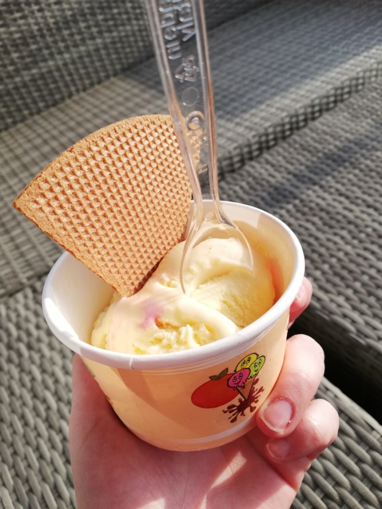 Ja, het is ijsjesweer! Vlak bij mij is er een ijsjesverkooppunt. Ik reed er even langs en bestelde een bolletje ijs in een potje. Dit is de smaak mango. Heel lekker!