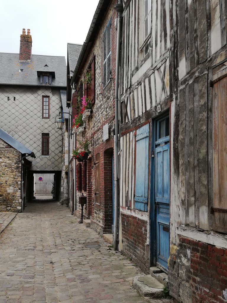 We hebben de brug bekeken, tijd om er over te rijden richting Honfleur. Hier zullen we deze namiddag ook vertoeven. Thuis hebben we al een adres voor een parking opgezocht. De GPS leidt ons via smalle straatjes, terwijl de parking ook bereikbaar zou zijn geweest via een andere straat. De parking staat goed vol, maar we hebben geluk. Er rijdt juist iemand weg. We doen onze regenjassen aan, want de buienradar voorspelt toch wat regen. Uiteindelijk duurde het nog een hele tijd voor die voorspelde regen er was, maar de regenjassen hebben we zeker nodig gehad.