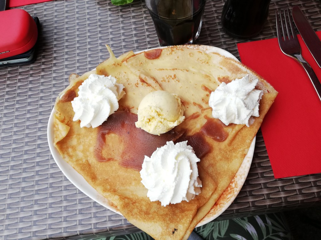 In Honfleur is het gezellig druk. We wandelen rond en strijken neer op een terrasje. De eerste crêpe van de week is een feit. En het flesje cola van 33 cl ook. 🙂 😉