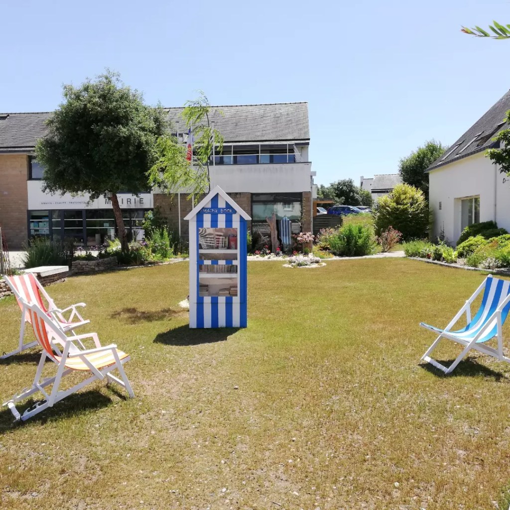 Oh, mijn boekenhartje stuitert helemaal. De minibieb. Voornamelijk Franse boeken, maar ook enkele Engelstalige boeken. En kijk eens hoe ze leuk ze de inrichting hebben gedaan met die strandstoelen…