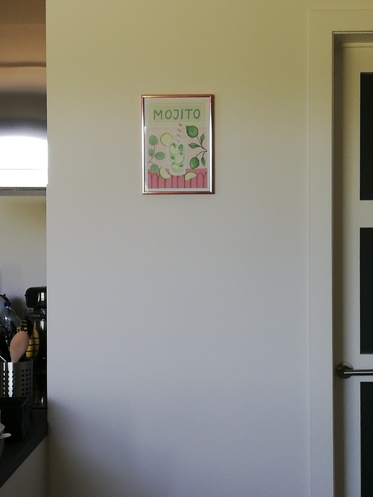 Het bevestigen aan de muur liet ik over aan papa. Met een hamer, een meter, een potlood en een waterpas kwam je al heel ver. Een boormachine was niet nodig als je de haakjes van Desenio zelf gebruikte. Deze zijn apart bij te kopen en zitten niet standaard bij de kader.
