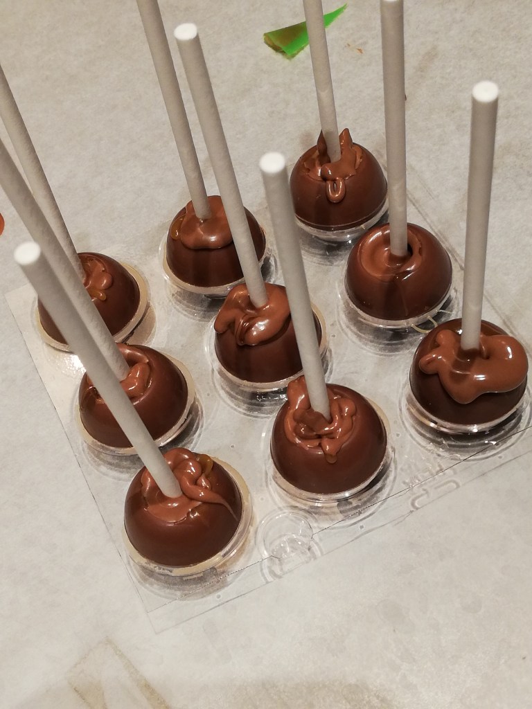 Eerst maakten we de lolly’s. Deze werden gevuld met caramel, zodat de stokjes erin konden blijven staan. Om het chocoladebolletje te sluiten, spoten we nog wat chocolade eromheen. Dit werd dan in de koelkast gezet om op te stijven.