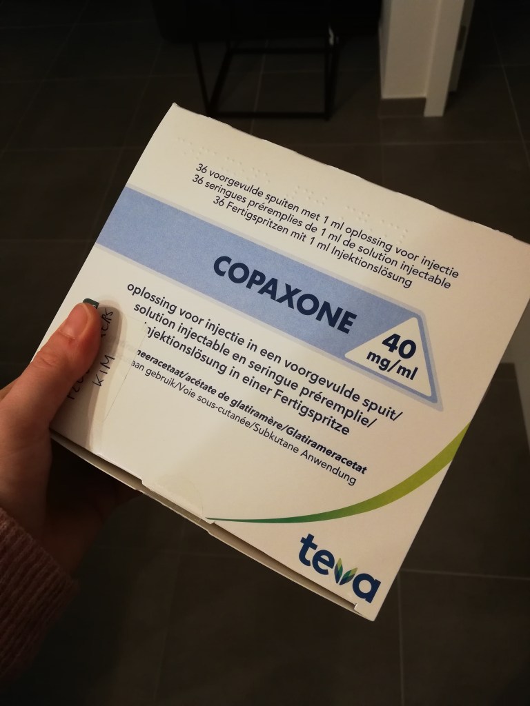 Vanaf dit jaar is de verpakking van Copaxone veranderd. In plaats van 12 voorgevulde spuiten (= 1 maand), zijn het nu 36 voorgevulde spuiten (= 3 maanden). Allemaal goed en wel, maar krijg dit maar eens weggestopt in je koelkast.