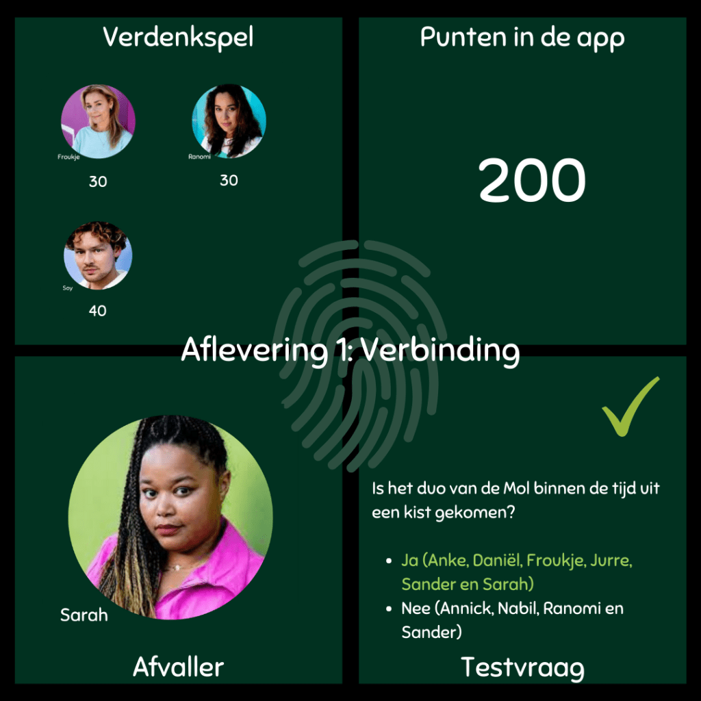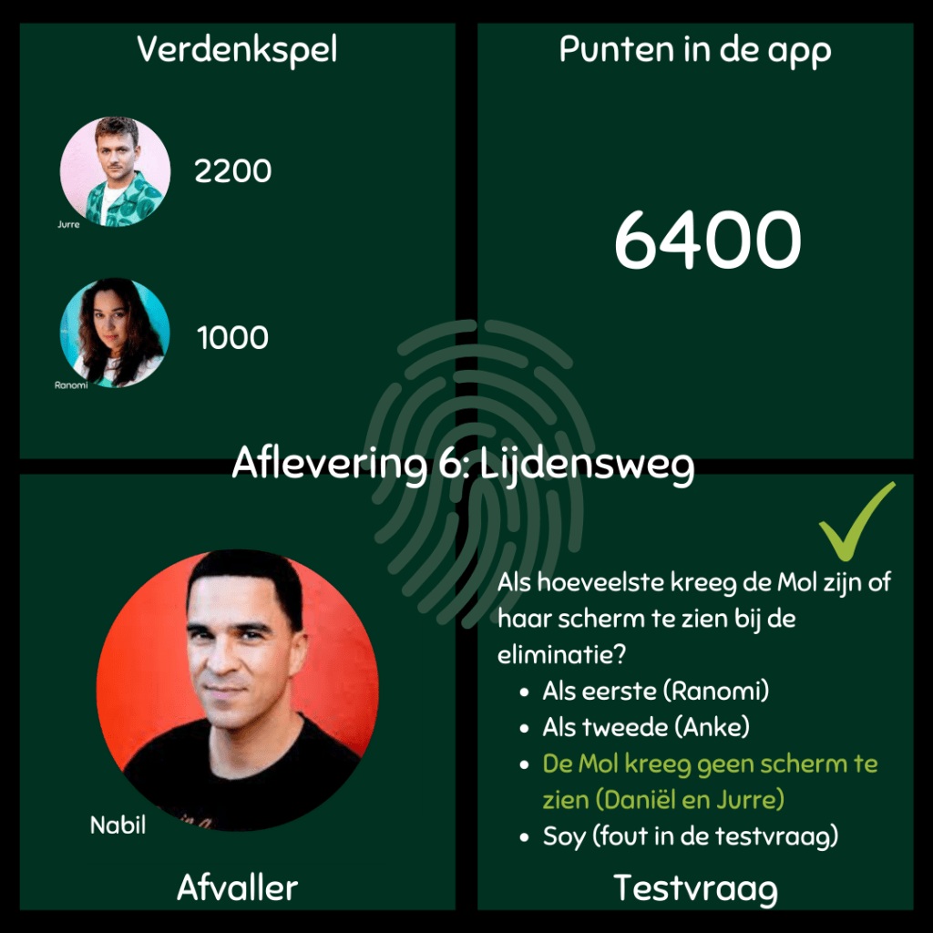 De testvraag in de app ging over de opdracht in het doolhof. Deze keer heb ik niet op Ranomi ingevuld, maar op, tja, ik wist eigenlijk niet wie. In dit soort opdrachten gaat de mol altijd als één van de eersten (in volgorde waren dit Daniël, Nabil en Jurre) en laat de mol zich ‘per ongeluk’ vangen. De testvraag heb ik ook weer tactisch proberen in te zetten.