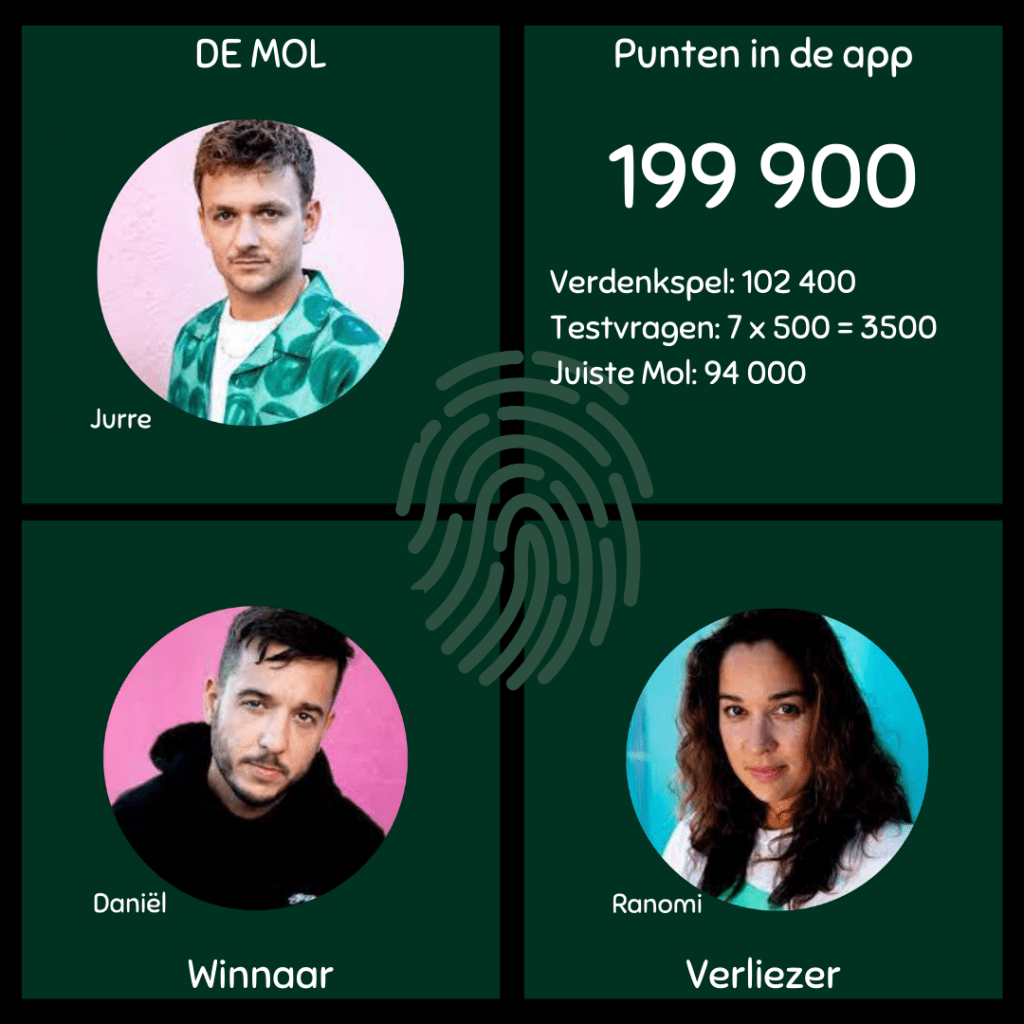 JAAAAAAAAAAAAAAA! IK HAD HET JUIST! JURRE IS DE MOL! En de winnaar en verliezer heb ik en passant ook goed geraden.