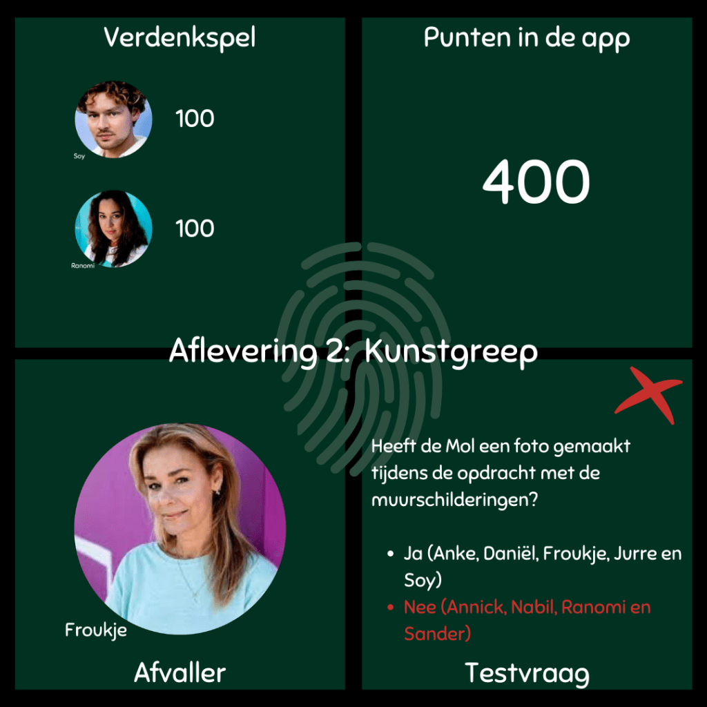 In de tweede opdracht wordt de groep weer in twee gesplitst. Anke, Daniël, Froukje en Soy moeten muurschilderingen gaan zoeken aan de hand van een foto met dingen uit een winkel van Sinkel die gemaakt werd door de andere groep. Conclusie: Soy is niet de mol. Soy is de surrogaatmol die zich verdacht wil maken.