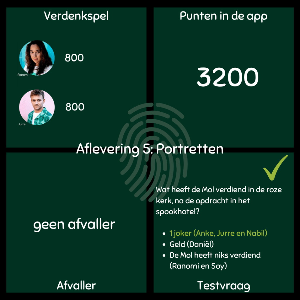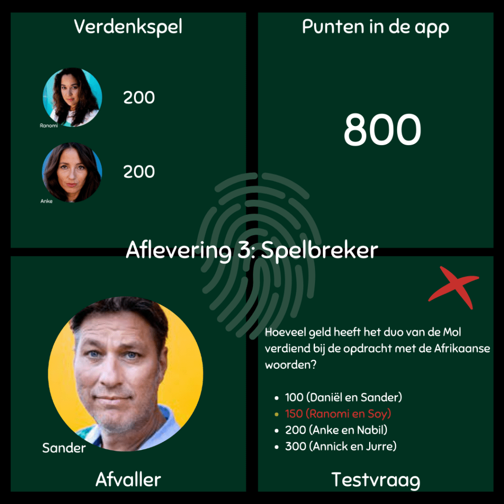 Deze aflevering heb ik ingezet op Jurre en Daniël. Jurre is mijn mol en Daniël weet dat Jurre de mol is. Er gaat ook een theorie rond dat de afvaller al geraden kan worden door het schema van de Wie is de mol?-podcast. Elke aflevering komen twee kandidaten langs: