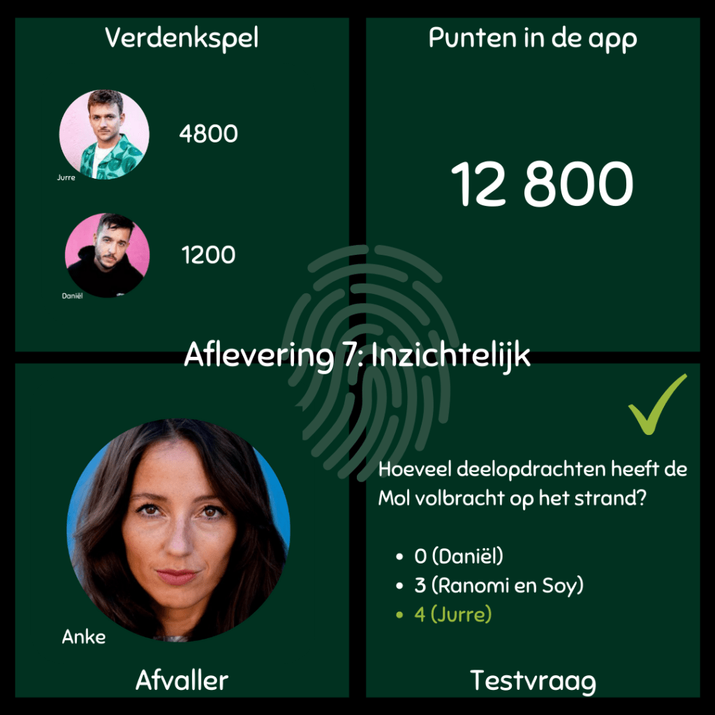 Tijdens deze aflevering mochten de kandidaten paragliden en strandopdrachten doen voor een afspraak met de mol. Jurre won deze opdracht en had dus een afspraak met de mol. Of met zichzelf? De eliminatie vond plaats in een doolhof, want de kandidaten vulden de test in op papier. De andere kandidaten én de kijkers hadden dus inzicht op de antwoorden. Anke verdacht Ranomi en Soy en ligt er uit. Daniël verdenkt Jurre en Jurre verdenkt Daniël. Niemand anders verdenkt Daniël en dat de grootverdiener van deze groep de mol is, lijkt me onwaarschijnlijk. De vorige seizoenen zat de mol vaak op diegene die hem het meest verdacht. Daarnaast eindigt de tijd van Jurre volgens de montage op 29:57. 2 + 9 + 5 + 7 = 23. De mol van het 23ste seizoen. Ik zit zo ver in de Jurre tunnel dat ik er echt niet meer uit kom. Jurre is de mol en Daniël weet het.