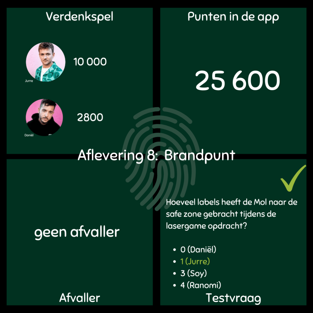 Ik blijf spreiden op Jurre en Daniël. Mijn mol en een finalist. Of ja, we weten dat Jurre sowieso een finalist is, want hij kreeg de witte vrijstelling. Oftewel, hij zit in de finale. Als mol en als kandidaat.