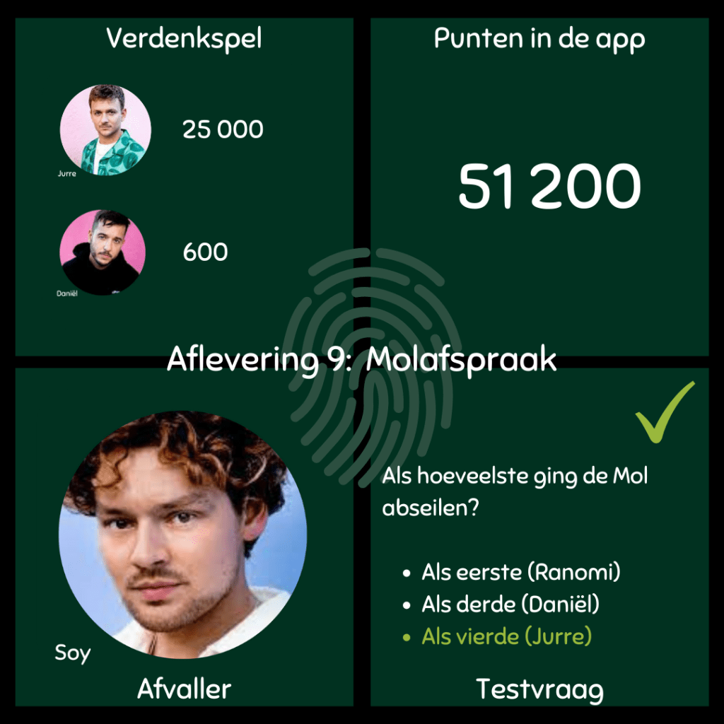 - Aflevering 7: Inzichtelijk. Tijdens de analoge test in het doolhof komt Jurre als laatste van de groep binnen op 29:57. 2 + 9 + 5 + 7 = 23. De mol van het 23ste seizoen.