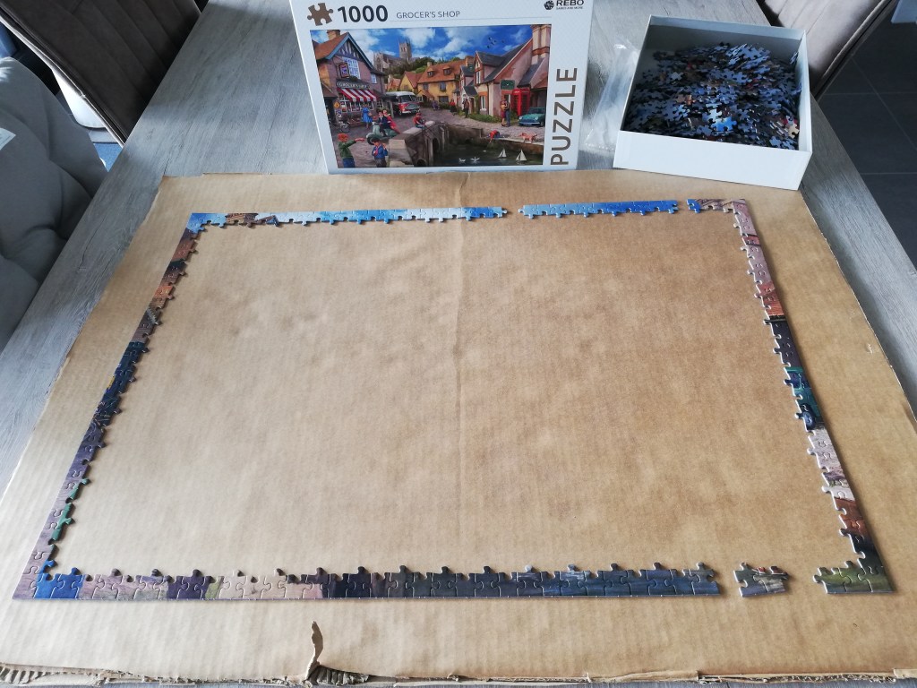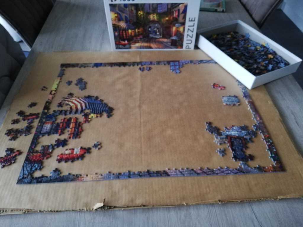 Ik maak gebruik van een groot dik karton om mijn puzzel op te maken. Zo kan ik het makkelijk verschuiven indien nodig. En een stuk karton is goedkoper dan een puzzelmat. 😉